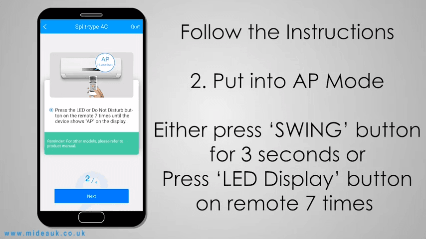 Before proceeding, you’ll need to put the air conditioner into AP mode with the remote. Locate the button that looks like a lightbulb and press it seven times. That will put the air conditioner in AP mode.